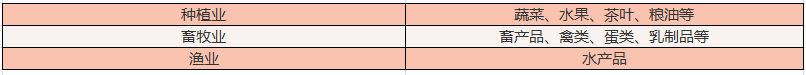 按产品级别分,包括初级产品、初加工产品、深加工产品;按产品类别分,包括农林产品及其加工品、畜禽类、水产类、饮品类和其他产品。